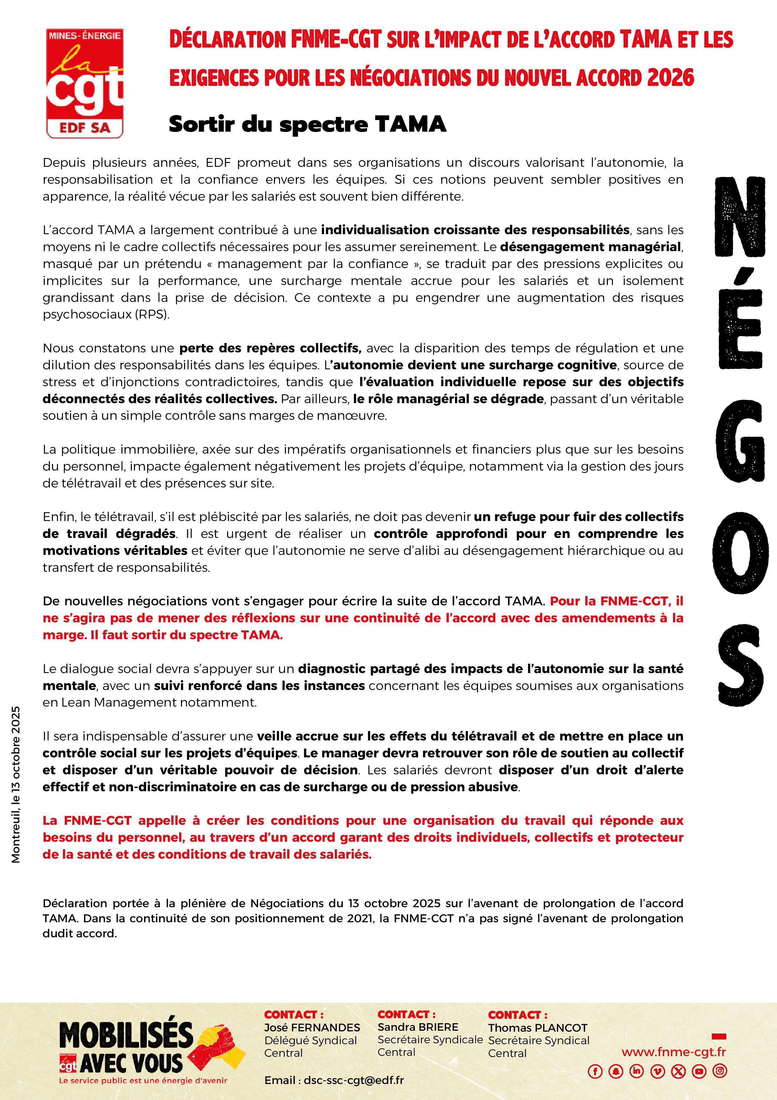 La FNME-CGT dénonce les effets de l’accord TAMA : individualisation des responsabilités, surcharge mentale, perte des repères collectifs et risques psychosociaux. Elle refuse sa prolongation et exige un nouvel accord garantissant santé, droits collectifs et rôle managérial renforcé.