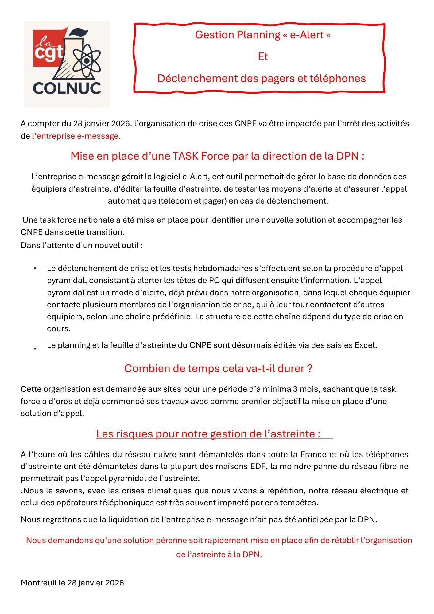 L’arrêt non anticipé d’e‑message fragilise l’organisation de crise des CNPE. Les solutions provisoires imposées (appel pyramidal, Excel) exposent les sites à des risques majeurs. La CGT dénonce ce manque d’anticipation et exige une solution fiable et pérenne sans délai.