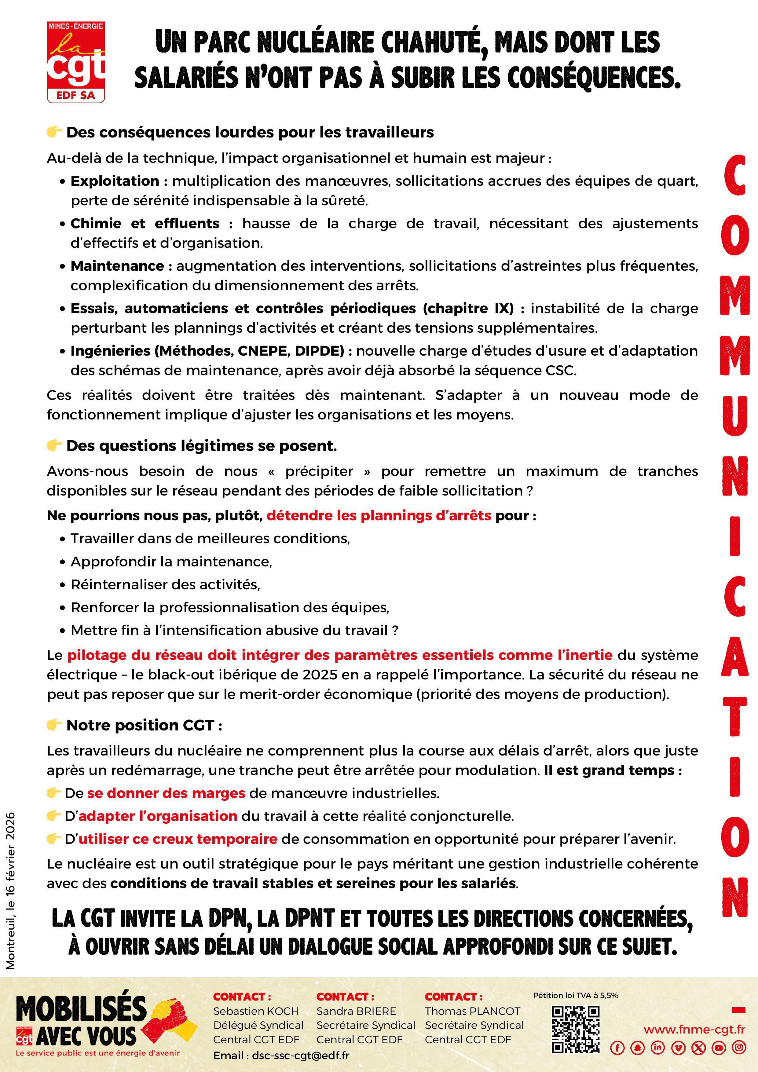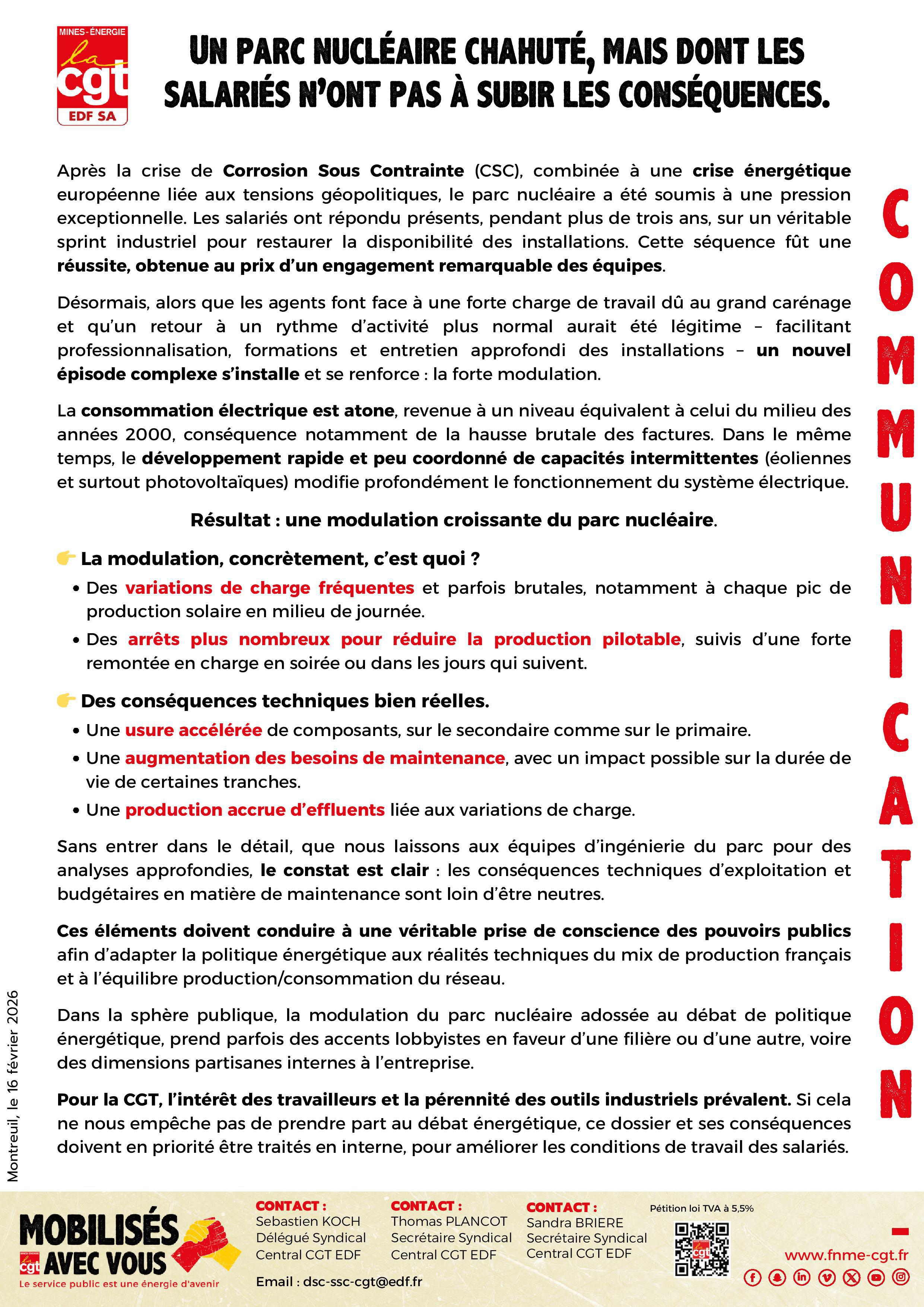 Le parc nucléaire subit une forte modulation liée à la baisse de consommation et au développement des renouvelables, entraînant usure, surcharge et désorganisation du travail. La CGT demande des moyens, une adaptation des plannings et un vrai dialogue social.