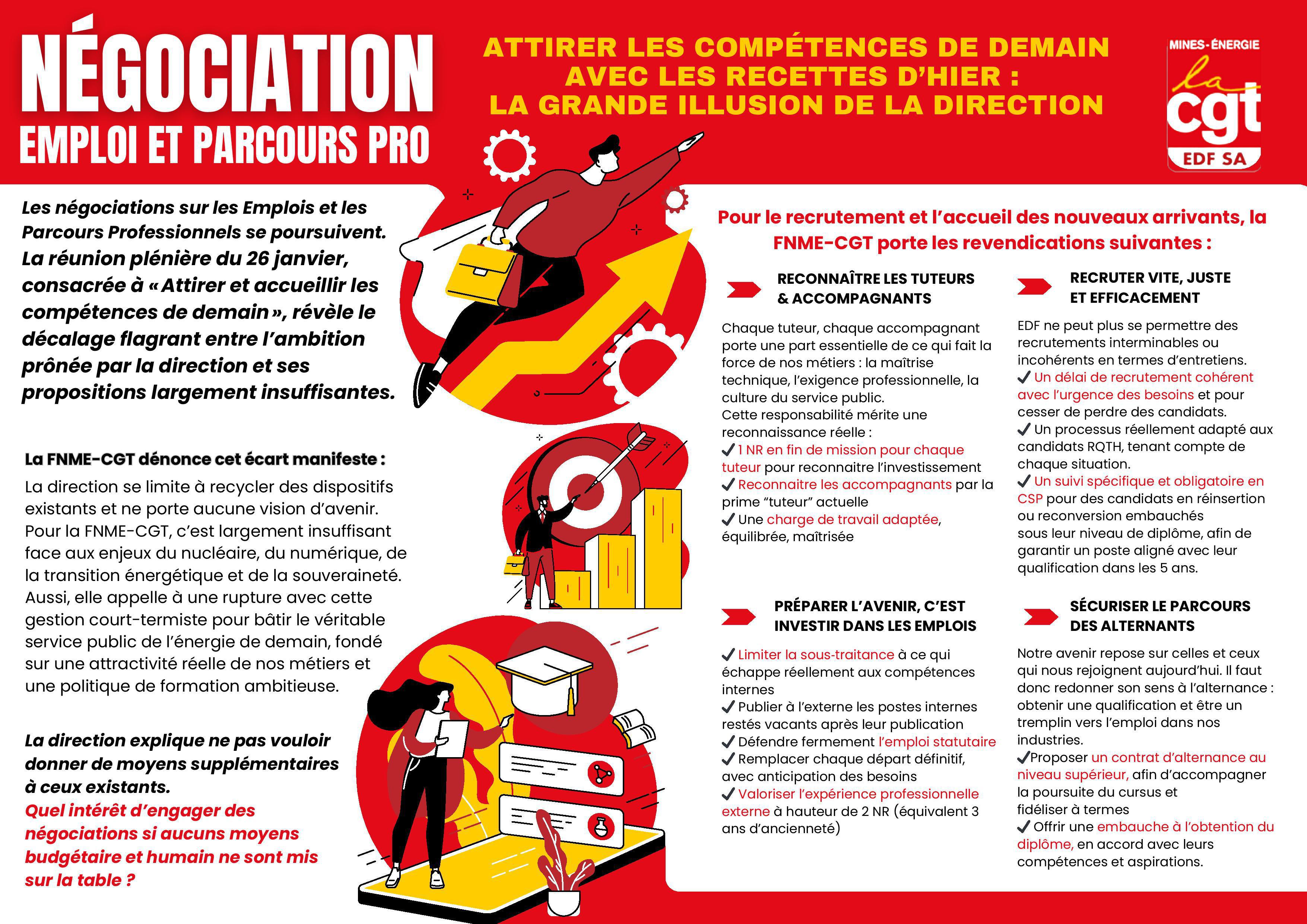 La CGT dénonce le manque d’ambition de la direction sur l’emploi et les parcours pro : recyclage de mesures anciennes, absence de vision et moyens. Elle exige reconnaissance des tuteurs, recrutements rapides, limitation de la sous‑traitance et sécurisation des alternants