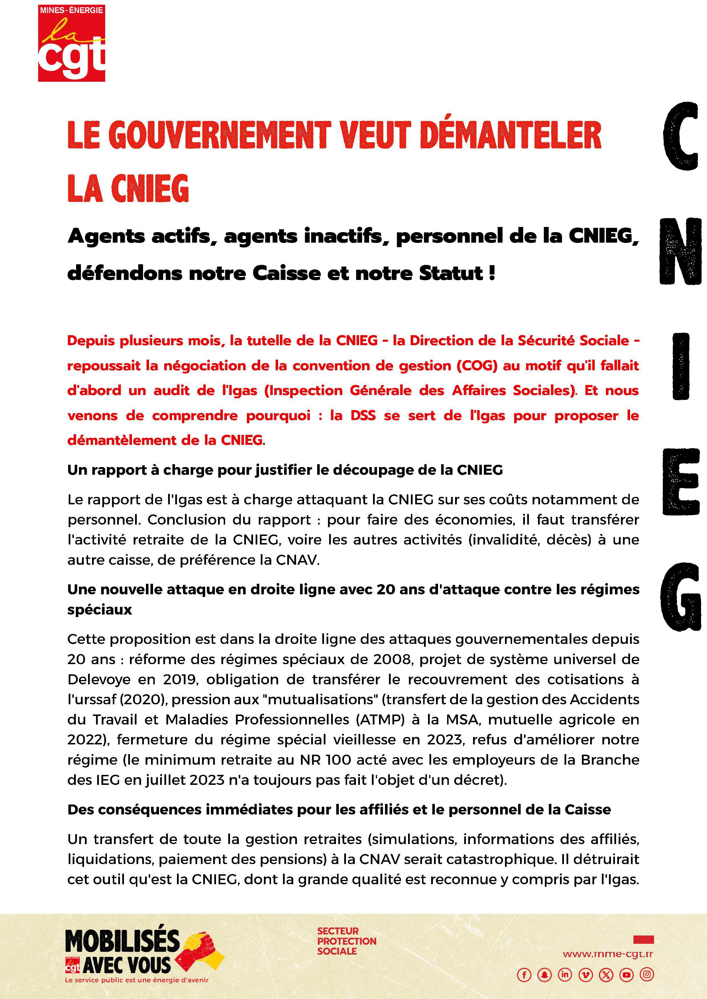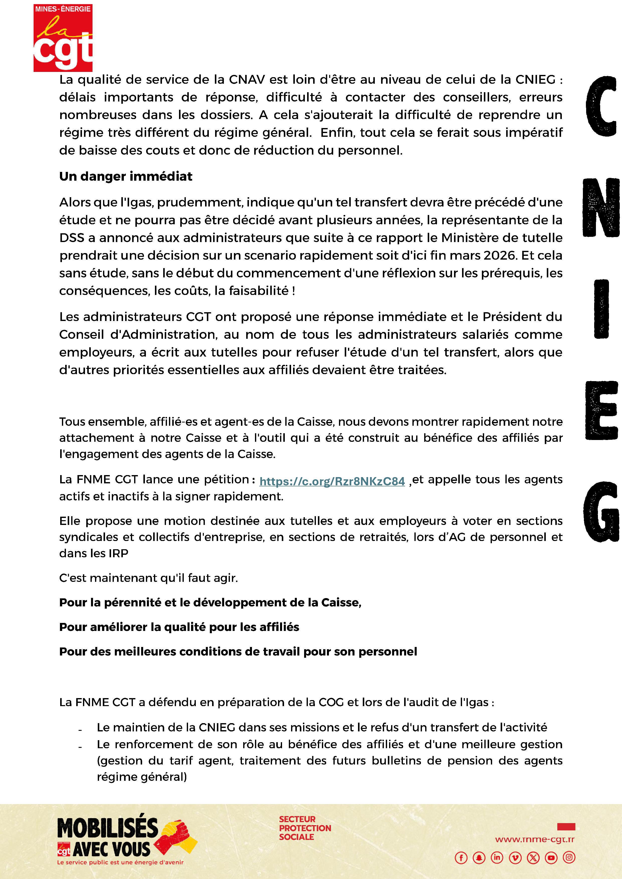 Le gouvernement envisage de démanteler la CNIEG en transférant ses missions, notamment les retraites, vers la CNAV. La FNME‑CGT alerte sur un risque de dégradation du service, de suppressions de postes et appelle agents et affiliés à défendre la Caisse.