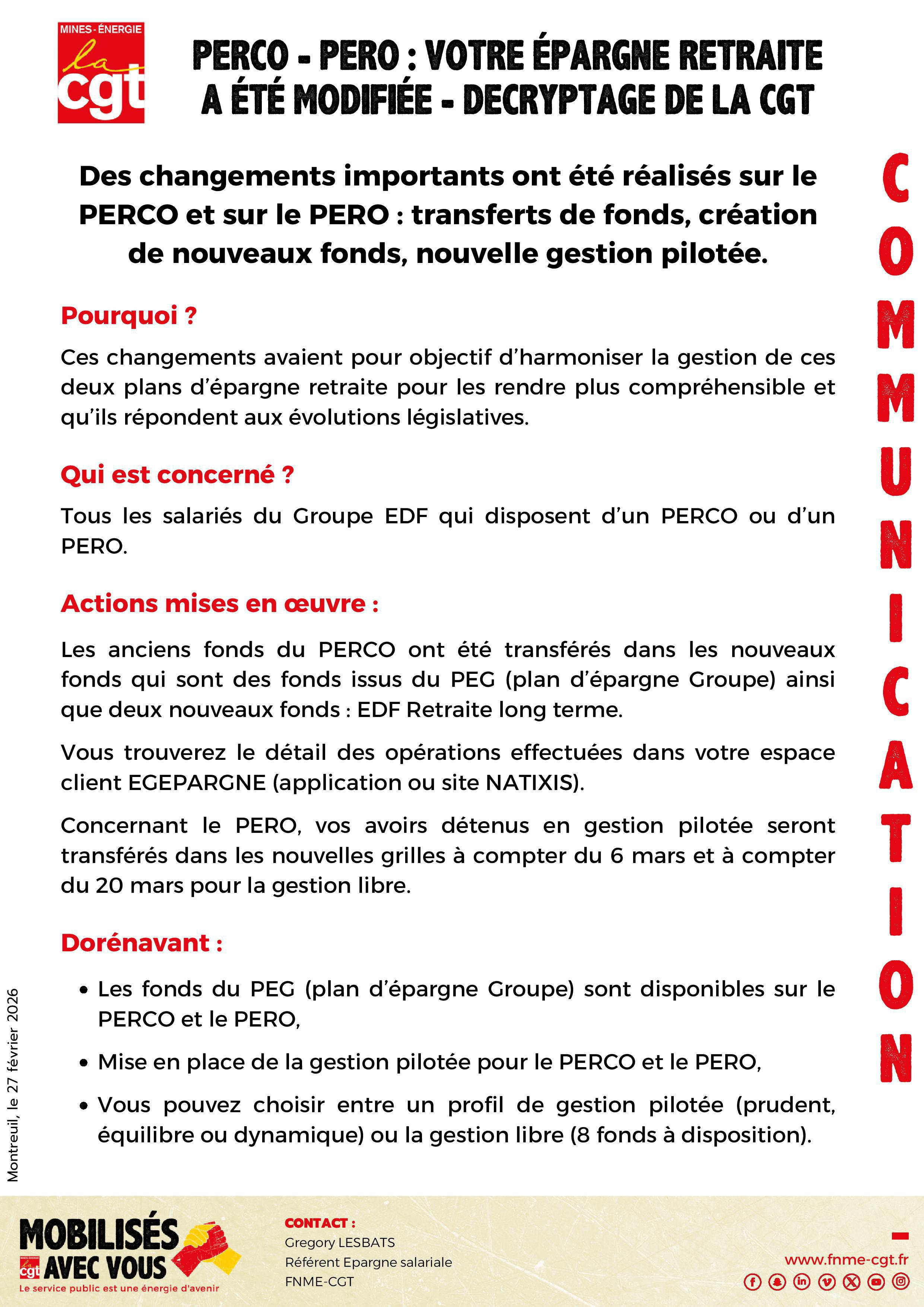 Les PERCO et PERO d’EDF évoluent : transferts vers de nouveaux fonds, gestion pilotée commune, choix de profils ou gestion libre. Les salariés doivent vérifier prélèvements et paramètres. La CGT juge ces changements utiles et réclame transparence et frais pris en charge.